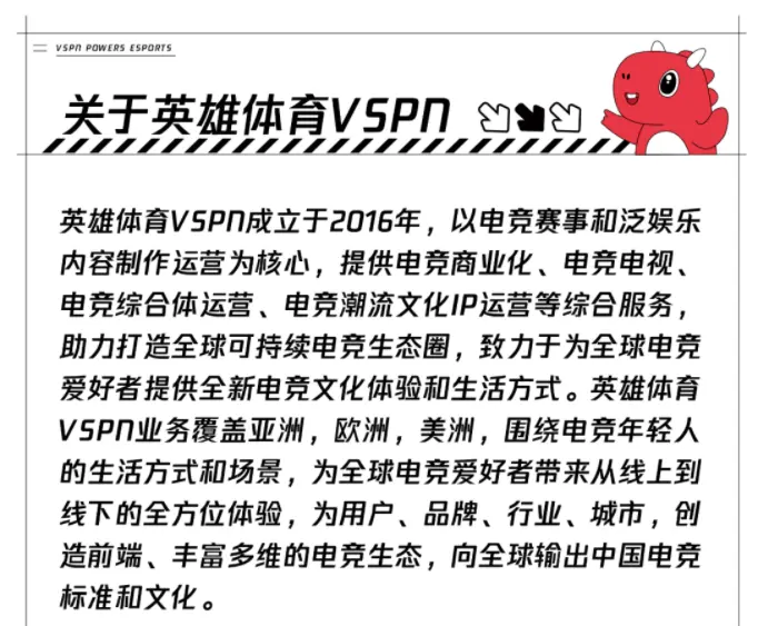 英雄体育VSPN是亚洲最大电竞赛事运营商,以电竞赛事和泛娱乐内容制作运营为核心,提供赛事及内容制作、电竞商业化、电竞潮流IP运营、艺人孵化及管理、电竞电视等综合服务,致力于构建全球可持续电竞生态圈。业务覆盖亚洲,欧洲,美洲,为用户,品牌,行业,城市,创造前端,丰富多维的电竞生态,向全球输出中国电竞标准和文化。为全球电竞运动爱好者带来从线上到线下的全方位体验。目前已成功组织举办了包括《Jakarta Asian Games》《King Pro League》《Arena of Valor International Championship》《Arena of Valor World Cup》《PeaceKeeper Elite League》《EACC》《WCG》《CFS》《LCK》《PUBG Champions League》《PUBG Mobile Pro League》《Call OF Duty Mobile World Champions Ship》《PUBG Global Championship》国内、国际性电竞赛事。