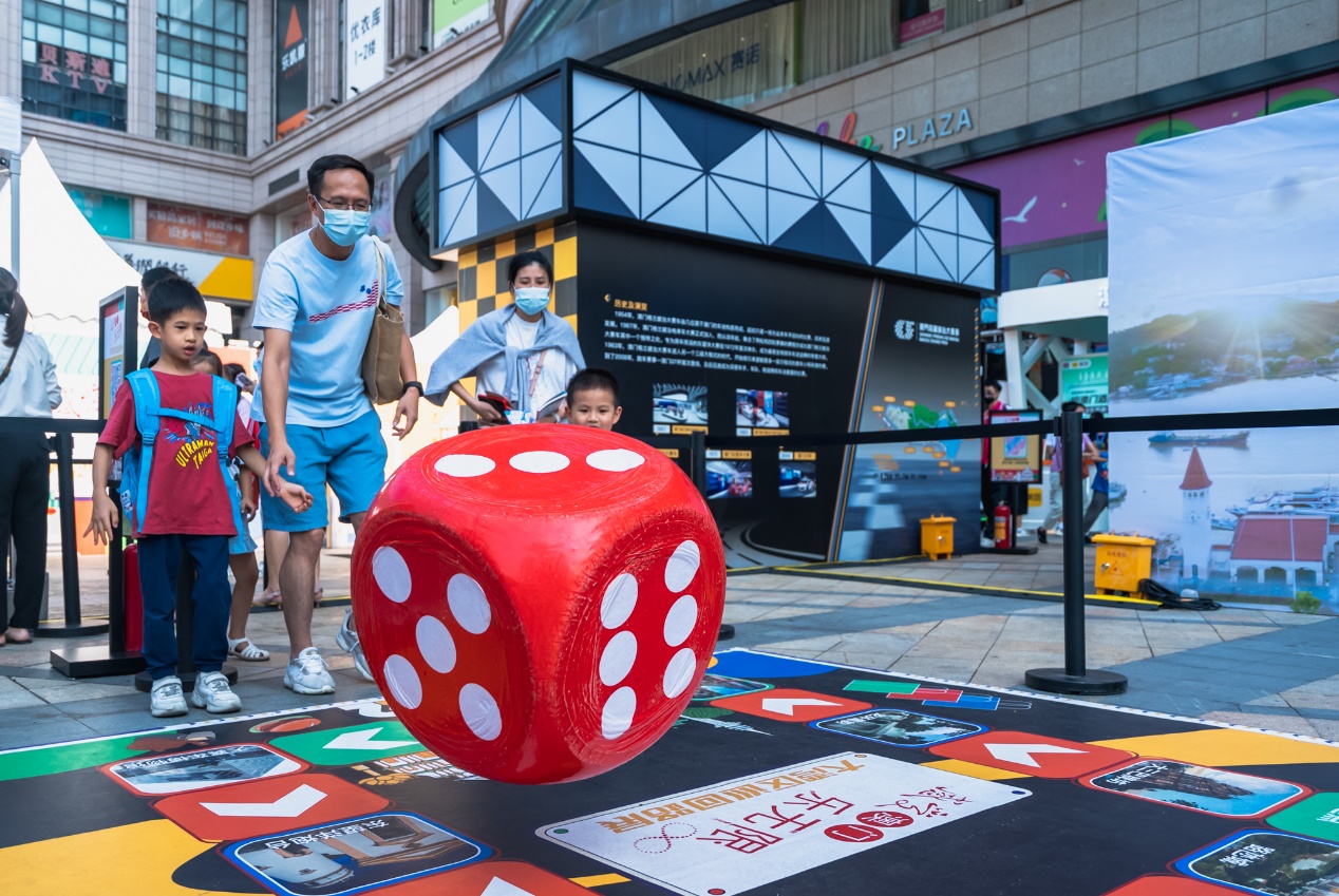 除了拍照打卡,现场还布置了充满澳门元素的互动体验区,可以感受到澳门格兰披治大赛车乐趣的赛车体验游戏,以澳门景点为主题的飞行棋游戏,还有涂鸦墙、亲子互动游乐区等板块,都充满了趣味好玩的互动体验,非常适合一家大小前往游玩。晚上会场还安排了光影MINISHOW,高达4米的立体大三巴,在夜色中定时上演的光影表演,让中山市民仿佛置身于绚丽多彩的澳门夜景之中。