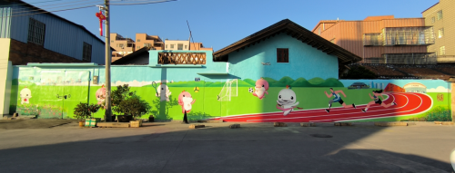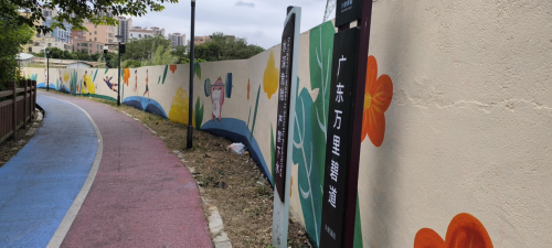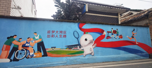 墙绘以第十五届全运会的吉祥物“喜洋洋”与“乐融融”的可爱形象为核心视觉元素,将残健共融的运动风采与志愿者的热情服务和谐相融。整幅画面洋溢着热烈欢快的赛事气息,构成了一幕充满感染力的生动图景。同时,设计中融入了白云区的标志性建筑、景观以及绿叶花簇等自然元素,色彩鲜明,充满动感。整体设计巧妙地将体育精神与生态理念相融合,既呼应了“活力大湾区”的主题,也为乡村绿道与街巷注入了活力与温度,成为一处颇具艺术感的景观。