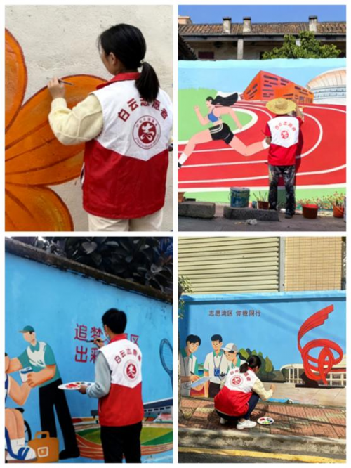 近期,为结合第十五届全运会与残特奥会,深化“云青绘”品牌,共青团白云区委员会发起了“青绘乡韵焕新行动”墙绘美化项目。汇聚了区青少年艺术志愿者协会的专业力量,分别在大源街大源村、江高镇长岗村、太和镇沙亭村、龙归街柏塘村四个地点顺利完成,总计绘画面积近300平方米。组织青年艺术家指导志愿者共同创作,不仅美化了乡村环境,更在实践中锤炼了青年团队的协作能力,生动诠释了“奉献、友爱、互助、进步”的志愿精神。